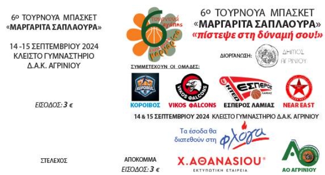Το 6ο τουρνουά αγάπης “Μαργαρίτα Σαπλαούρα” θα διοργανωθεί από το Δήμο Αγρινίου σε συνεργασία με τον Α.Ο. Αγρινίου στις 14 και 15 Αγρινίου στο κλειστό του ΔΑΚ Αγρινίου “Μιχάλης Κούσης”.