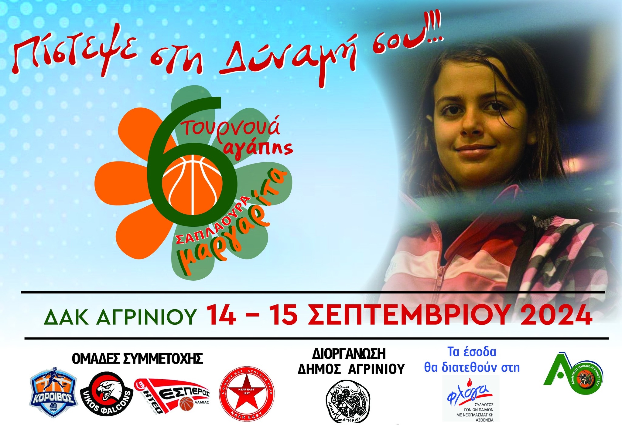 Για 6η συνεχόμενη χρονιά θα διοργανωθεί από το Δήμο Αγρινίου σε συνεργασία με τον Α.Ο. Αγρινίου το τουρνουά αγάπης “Μαργαρίτα Σαπλαούρα”.