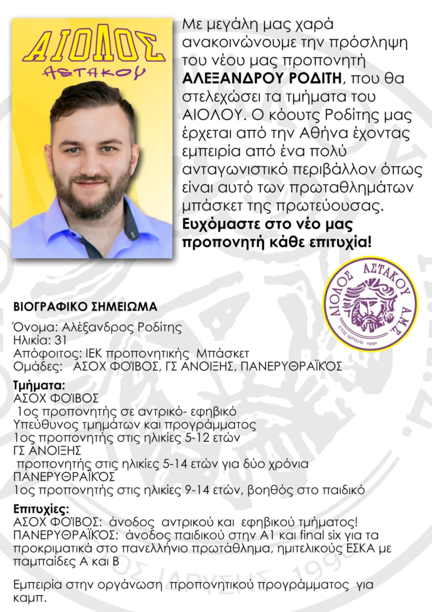 Ο Αίολος Αστακού ανακοίνωσε τον 31χρονο Αλέξανδρο Ροδίτη σαν τον νέο προπονητή των τμημάτων του.