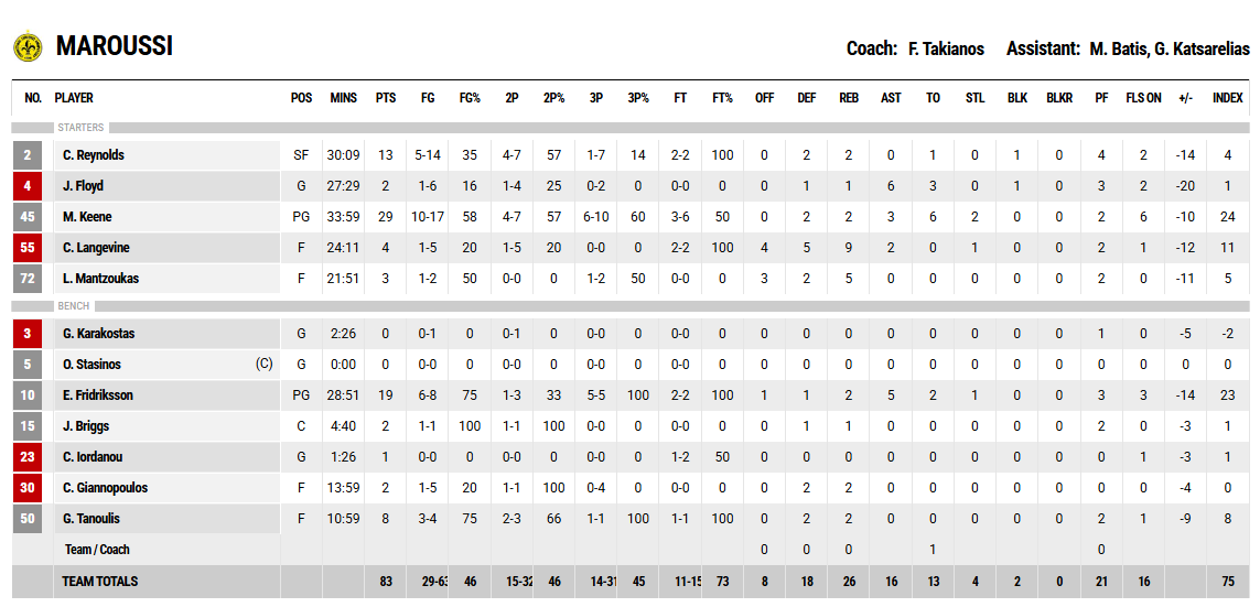 Από την άλλη, το Μαρούσι, παρά την καταπληκτική εμφάνιση του Κιν (29 πόντους), γνώρισε τη 17η ήττα του (5-17) δεχόμενος για δεύτερο σερί ματς 104 πόντους και τελείωσε τη regular season στην τελευταία θέση της βαθμολογίας.
