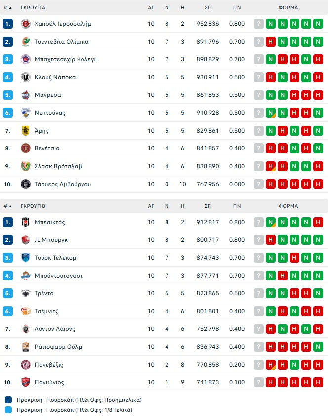 Πολλαπλή συγκατοίκηση στο πρώτο γκρουπ του EuroCup, όπου συμμετέχει και ο Άρης, καθώς άλλες τρεις ομάδες μοιράζονται μαζί του το ίδιο ρεκόρ, 5-5. Η Μανρέσα συνέτριψε με 99-82 την ως τώρα δεύτερη Τσεντεβίτα (ο Νίκος Χουγκάζ είχε 4 πόντους, 4 ριμπάουντ και 2 ασίστ σε 25 λεπτά), ενώ η Νεπτούνας επικράτησε 103-87 της Σλασκ στην Κλαϊπέντα και έφτασε επίσης στο 5-5. Η Μπαχτσεσεχίρ επιβλήθηκε 84-72 της Κλουζ και με 7-3 είναι μία ανάσα πίσω από την πρωτοπόρο Χάποελ Ιερουσαλήμ (8-2).