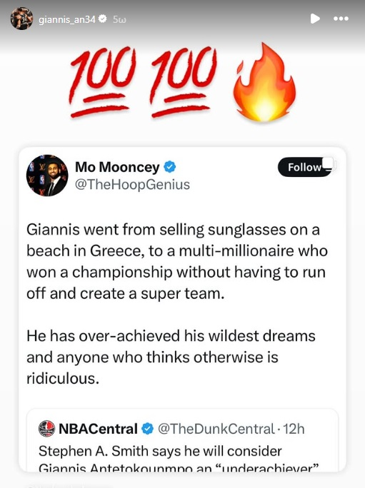 Ο Μο Μούνσεϊ, ένας άλλος αναλυτής, απάντησε στον Σμιθ με τον κατάλληλο τρόπο. «Ο Γιάννης έφτασε από το να πουλάει γυαλιά ηλίου σε μια παραλία στην Ελλάδα, στο να γίνει ένας πολυεκατομμυριούχος που κέρδισε ένα πρωτάθλημα χωρίς να χρειαστεί να πάει και να γίνει μέλος μιας σούπερ ομάδας. Έχει ξεπεράσει τα πιο τρελά του όνειρα και όποιος πιστεύει το αντίθετο είναι γελοίος», έγραψε στα social media, με τον 30χρονο άσο των Μπακς να αναδημοσιεύει την απάντησή του.