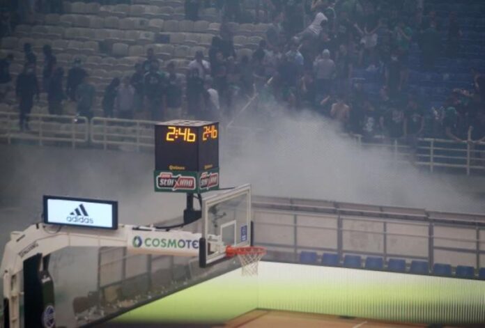 Ο τέταρτος τελικός της Basket League ανάμεσα στον Παναθηναϊκό και τον Ολυμπιακό διεκόπη στο 27′ έπειτα από τη ρίψη κροτίδων και καπνογόνων.