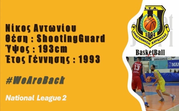 «Η ΑΝΑΓΕΝΝΗΣΗ ΚΑΡΔΙΤΣΑΣ 1904 B.C. ανακοινώνει την προσθήκη του Νίκου Αντωνίου στο ρόστερ της ανδρικής ομάδας .Ο Νίκος Αντωνίου είναι γεννημένος το 1993 έχει ύψος 1,92μ. και αγωνίζεται στη θέση του Shooting Guard . Έχει αγωνιστεί επί σειρά ετών στους Τιτάνες Παλαμά 2012-2014 , τον Α.Σ. Καρδίτσας τη περίοδο 2014-2016 όπου και πανηγύρισε μία άνοδο , επανήλθε στους Τιτάνες Παλαμά τη περίοδο 2016-2018 , έπειτα ακολούθησε η συμμετοχή του στον Α.Σ. Σοφάδων τη περίοδο 2018-2019 ,έπαιξε για την Αναγέννηση Καρδίτσας τη περίοδο 2019-2022 πανηγυρίζοντας μία ακόμα άνοδο και έως σήμερα ήταν ενταγμένος στους Τιτάνες Παλαμά . Νίκο σε καλωσορίζουμε στην οικογένεια της Αναγέννησης Καρδίτσας 1904 B.C. !!.»