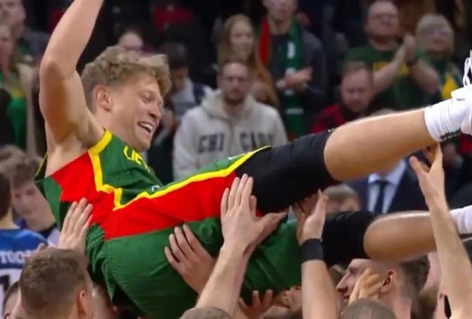 Οι παίκτες της Λιθουανίας σήκωσαν στα χέρια τον Μιντάουγκας Κουζμίνσκας, ο οποίος αγωνίστηκε για τελευταία φορά με την εθνική ομάδα της χώρας του.