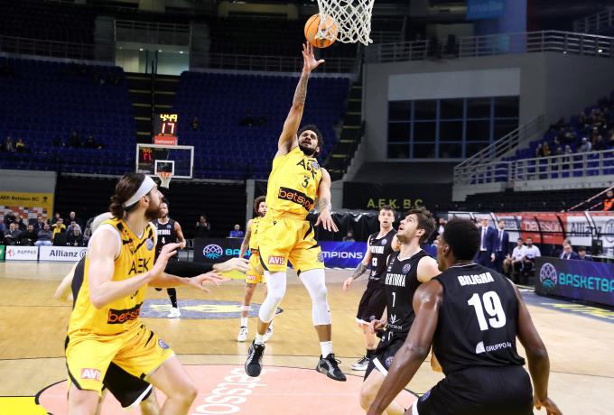 Με όπλο την περιφερειακή της γραμμή και τους Νετζήπογλου, Χαμπ, η ΑΕΚ ξέφυγε από νωρίς με 12-3. Ο δεύτερος συνέχισε να «πυροβολεί» από τα 6,75μ. για την πρώτη διψήφια διαφορά (22-12) και ο Γκόλντεν έγραψε το 27-16 προτού ο Ουίμς μειώσει στο 27-20 με τρίποντο και φάουλ στο τέλος της πρώτης περιόδου.
