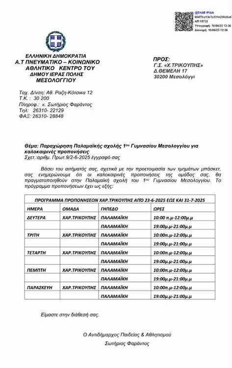 Για τις καλοκαιρινές προπονήσεις των παιδιών του δικού μας Συλλόγου έκρινε ότι μόνο στο γήπεδο της Παλαμαικής Σχολής μπορούν να προπονηθούν. Για όσους δεν γνωρίζουν στο συγκεκριμένο κλειστό δεν υπάρχει ούτε παρκέ,ούτε κλιματισμός. Ελπίζουμε να έχετε κ.Φαράντο καλές απαντήσεις να δώσετε στους γονείς των αθλητών μας για αυτή την άνιση μεταχείριση τους.