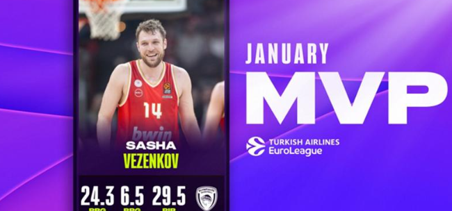 Πολυτιμότερος παίκτης του μήνα για τέταρτη φορά στην καριέρα του αναδείχθηκε ο Σάσα Βεζένκοφ. Ο φόργουορντ του Ολυμπιακού πήρε το σχετικό βραβείο για τον Ιανουάριο, όπου με τις εμφανίσεις του οδήγησε την ομάδα του στην κορυφή της κατάταξης.