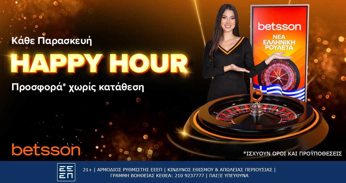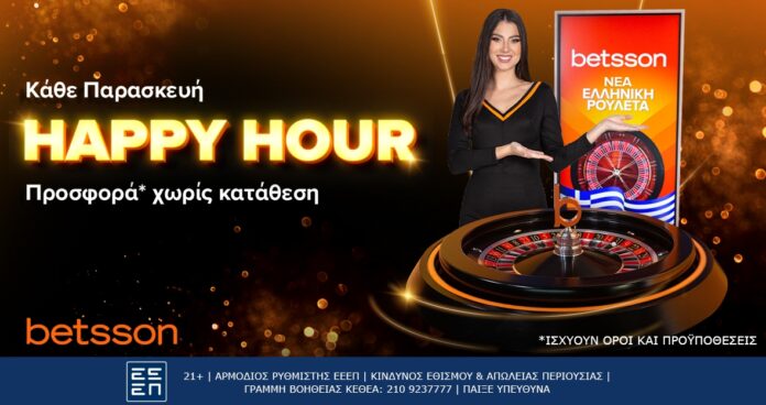 Το Happy Hour της Betsson Greek Roulette ξεκινάει κάθε Παρασκευή στις 20:00 και είναι χωρίς την προϋπόθεση κατάθεσης!