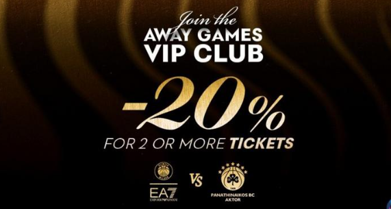 «Η ΚΑΕ Παναθηναϊκός AKTOR προσφέρει στους φιλάθλους της τη δυνατότητα να παρακολουθήσουν τον αγώνα με την EA7 Emporio Armani Milan (30/01, 21:30) στο εντυπωσιακό Globalsat VIP Lounge του ΟΑΚΑ, αγοράζοντας δύο ή περισσότερα εισιτήρια με έκπτωση 20%!