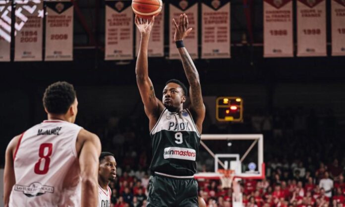 Στη δεύτερη περίοδο, ο Μπάρτλεϊ συνέχισε να είναι «καυτός» με τρία συνεχόμενα τρίποντα, στέλνοντας τον ΠΑΟΚ στο +14 (23-37). Ο Ντε Σόουζα έδωσε λύση στους γηπεδούχους με δύο βολές (25-37), όμως ο Παπαδάκης απάντησε με εντυπωσιακό φλόουτερ για το 25-39. Η Σολέ βρήκε λύσεις με τον Αγιαγί και έριξε τη διαφορά στους 10 (29-39), όμως ο Κρούζερ βρήκε ακόμη ένα μακρινό σουτ και έγραψε το 29-42. Ο ΜακΝίς τέλειωσε ωραία μία φάση από κοντά (31-42), πριν ο Κάμπελ κάνει τη διαφορά μονοψήφια με λέι απ για το 33-42. Ο ΜακΝίς συνέχισε το καλό διάστημα των Γάλλων με τυχερό καλάθι (35-42), με τον Αγιαγί να ευστοχεί σε βολές για το 37-43. Τα χαμένα ριμπάουντ συνέχισαν να πληγώνουν τον ΠΑΟΚ, που είδε τους γηπεδούχους να πλησιάζουν σε 39-43 με τον Ντε Σόουζα. Το πρώτο μέρος έληξε 40-43 υπέρ του «δικεφάλου του βορρά».