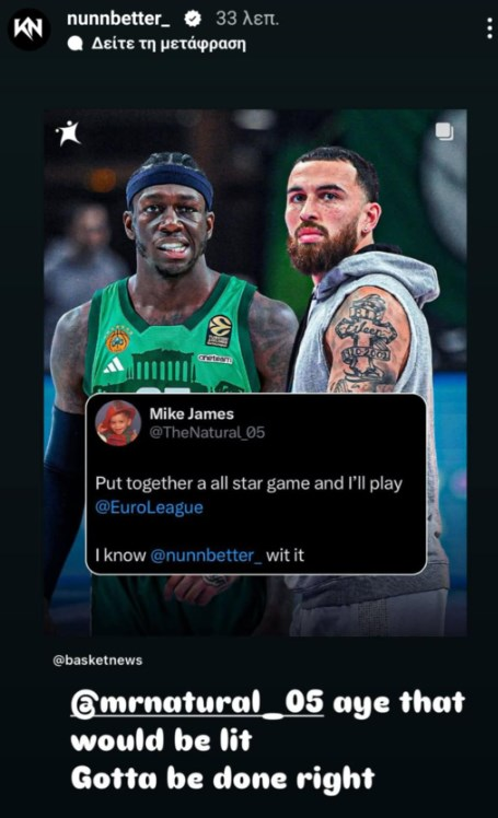 Ο σταρ του Παναθηναϊκού δημοσίευσε το σχετικό tweet του άλλοτε «πράσινου» Τζέιμς και δήλωσε πως θα ήταν τρομερό να γίνει ένα All Star Game στην Ευρωλίγκα.