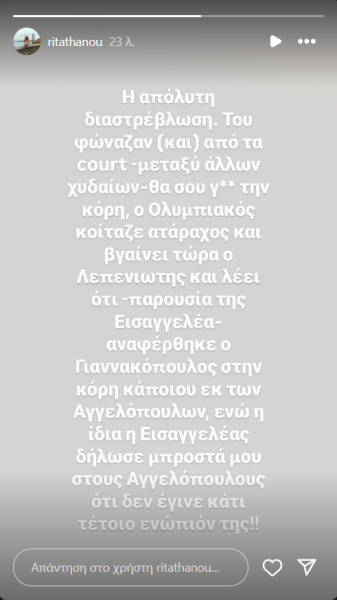 «Η απόλυτη διαστρέβλωση. Του φώναζαν (και) από τα court -μεταξύ άλλων χυδαίων- θα σου γ*** την κόρη, ο Ολυμπιακός κοίταζε ατάραχος και βγαίνει τώρα ο Λεπενιώτης και λέει ότι -παρουσία της εισαγγελέα- αναφέρθηκε ο Γιαννακόπουλος στην κόρη κάποιου εκ των Αγγελόπουλων, ενώ η ίδια η εισαγγελέας δήλωσε μπροστά στους Αγγελόπουλους ότι δεν έγινε κάτι τέτοιο ενώπιόν της!»